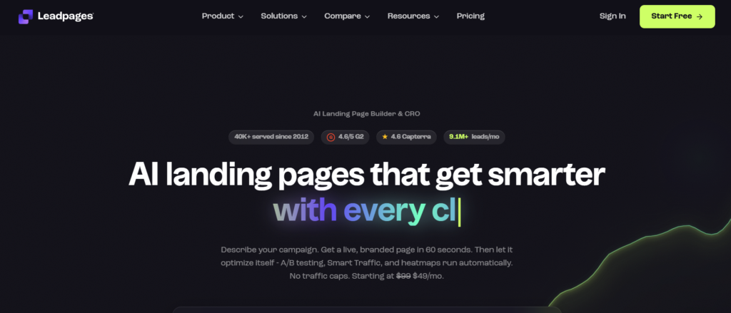 | Leadpages | Landing pages | $49/mo | No | Page builder | Moderate | Limited |